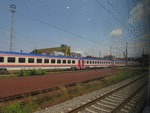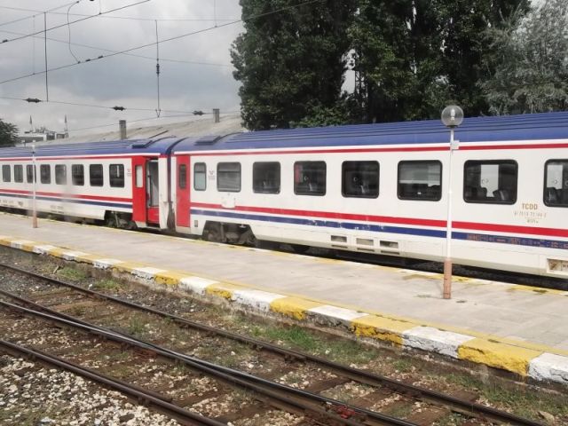 A view from 2 types of second class passenger cars "WSPlm" of TCDD ( Turkiye Cumhuriyeti Devlet Demiryollari / Turkish Railways ) "Trakya" , standing at railway station Uzunkopru in composition of train with number 12703 to Istanbul HalkalI.