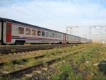 A second class passenger car "WSPlm" of TCDD ( Turkiye Cumhuriyeti Devlet Demiryollari / Turkish Railways ) "Trakya" standing at railway station Calatca in composition of train with number 12702 from Istanbul HalkalI to KapIkule.