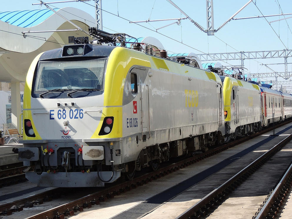 A view between 2 electric locomotives of class 68 , both owned by TCDD ( Turkiye Cumhuriyeti Devlet Demiryollari / Turkish Railways ) "Trakya" , standing at railway station Istanbul HalkalI with passenger trains.My impression about visiting that European part of Turkey , you can see on this adress:
