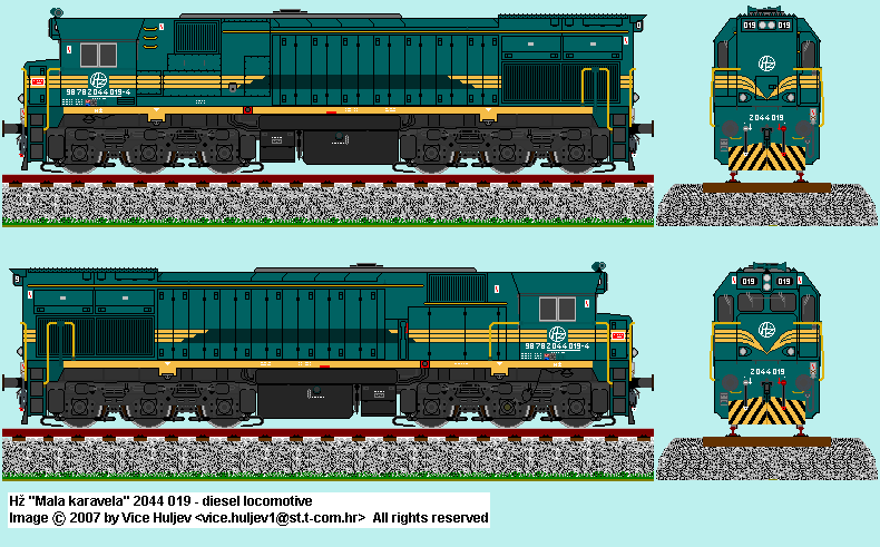 | Hž 2044 019 diesel locomotive, in orginal old green color with orginal EMD lights Nicknamed ''mala karavela'' Drawn by : Vice Huljev vice.huljev1@st.t-com.hr |