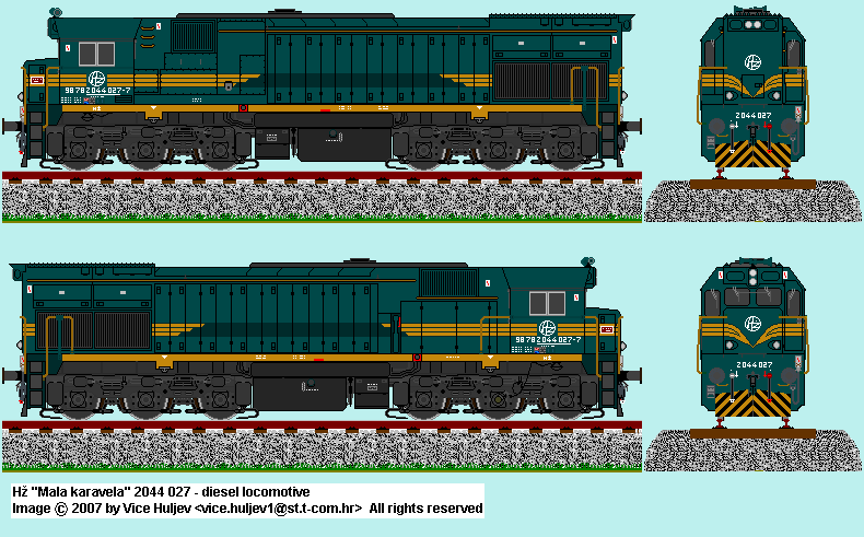 | Hž 2044 007 diesel locomotive, in orginal old green color with orginal EMD lights Nicknamed ''mala karavela'' Drawn by : Vice Huljev vice.huljev1@st.t-com.hr |