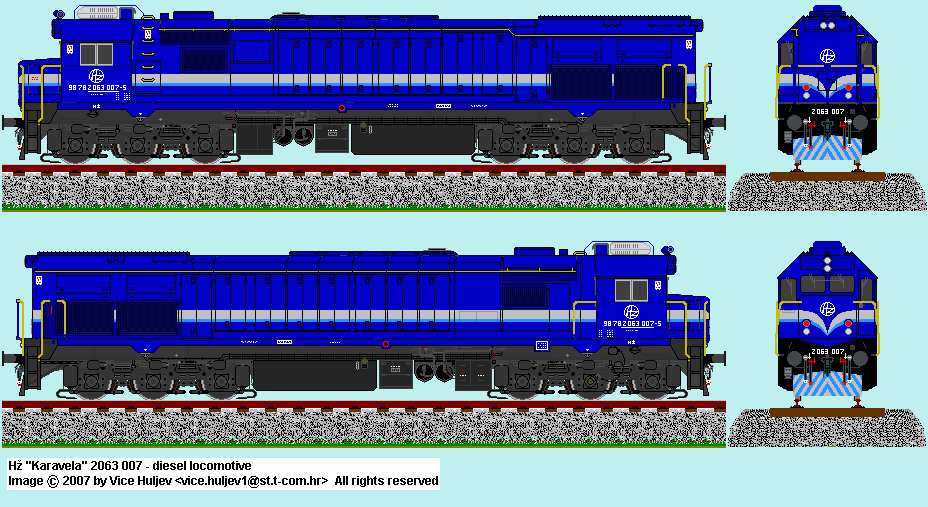 | Hž 2063 006 diesel locomotive, in blue color before revision,without air-condition and with old EMD ''frog'' light. Nicknamed ''karavela'' Drawn by : Vice Huljev vice.huljev1@st.t-com.hr |