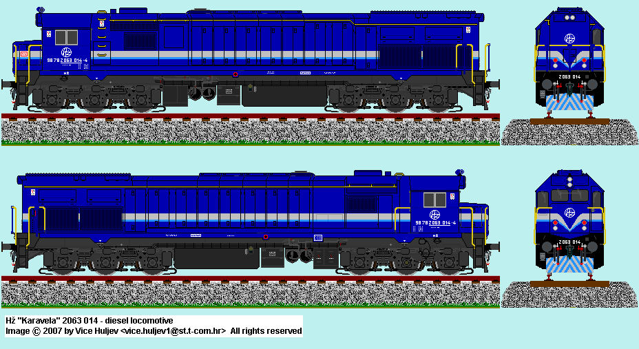 | Hž 2063 014 diesel locomotive, in blue color before revision Nicknamed ''karavela'' Drawn: Vice Huljev <vice.huljev1@st.t-com.hr> |