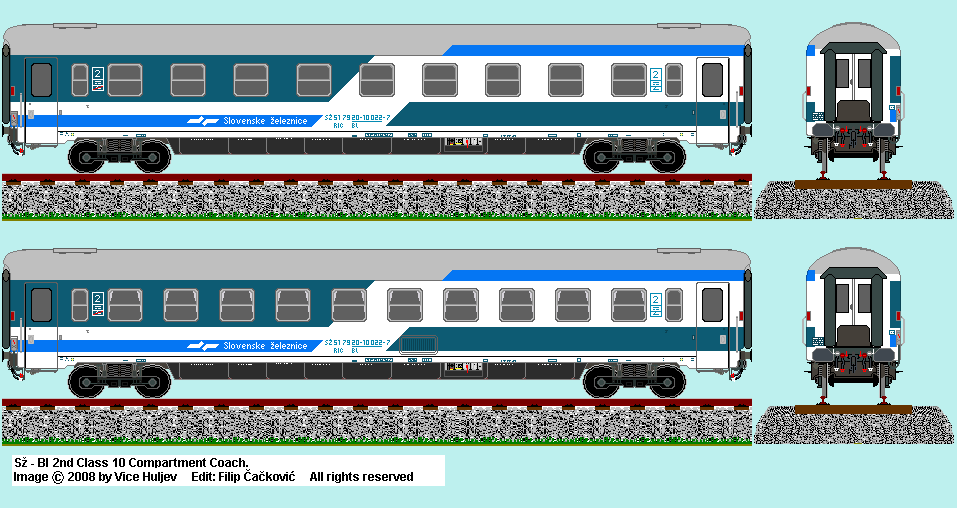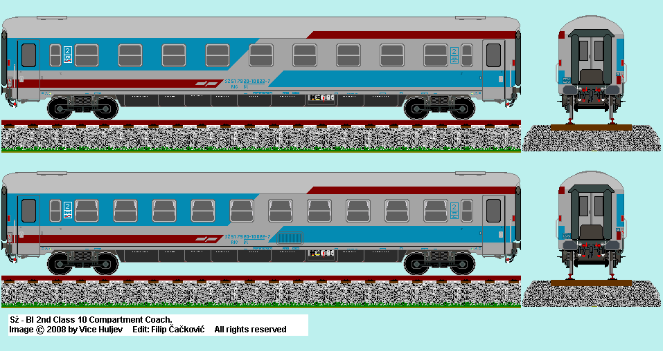 | HZ Bl 2nd class 9 comparment coach in classic livery. Drawn by : Filip Cackovic Based on image by : Vice Huljev <vice.huljev1@st.t-com.hr> |