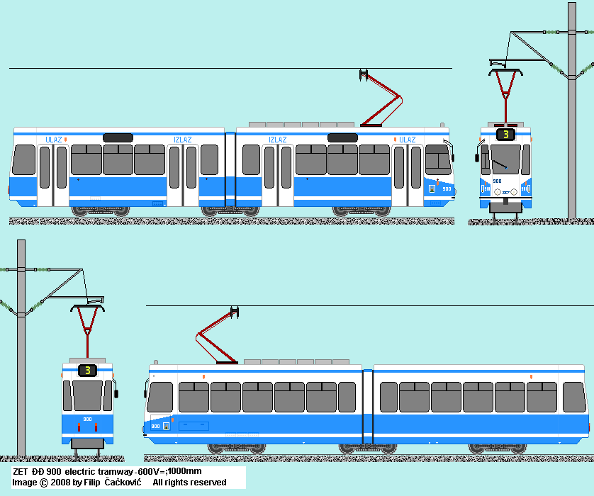 | Prototype tram 900. ZET tram type 900 (ĐĐ type JZT-1) (built by Duro Daković, Slavonski Brod). Prototip tramvaja 900. ZET tramvaj tip 900 (ĐĐ tip JZT-1 (sagradio Đuro Đaković, Slavonski Brod) |