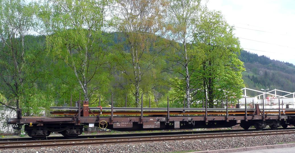 | This new flat wagon 31 81 3506 083-4 type Rns-z of RailCargo Austria, built 2009 by MEVA S.A., Drobeta Turnu-Severin, Romania, is part of a rail transport at Leoben-Donawitz. Total length 22.35 m, loading length 21 m, empty weight 25300 kg, recognizable by the oval openings on the side. Easter sunday, 2010-04-04. |
