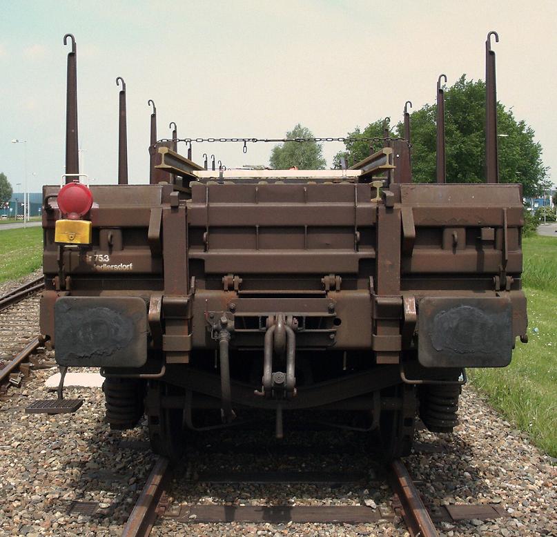 | Rail transport on flat cars, detail. The rails are earthed with cables connected to the frame. Leoben Donawitz (voestalpine steel works), 2009-09-24. |