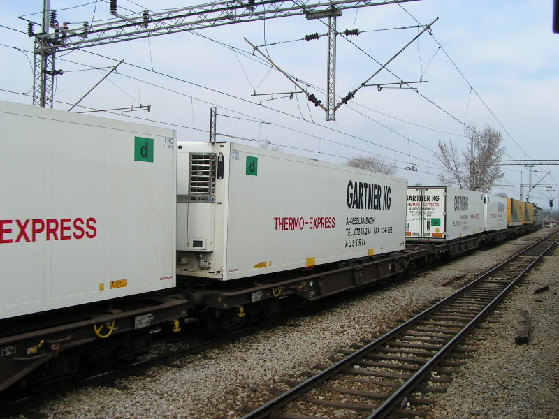 Beton sleepers for the new tracks between MÁV line number 120a Rákos and Rákoshegy at an ÖBB flat wagon. 11.06.2002