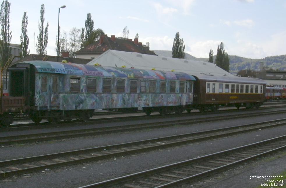 A very, very old car was parked at Klagenfurt Hbf. This Bp4üh car is used for nostalgic trains only. 03/16/2003