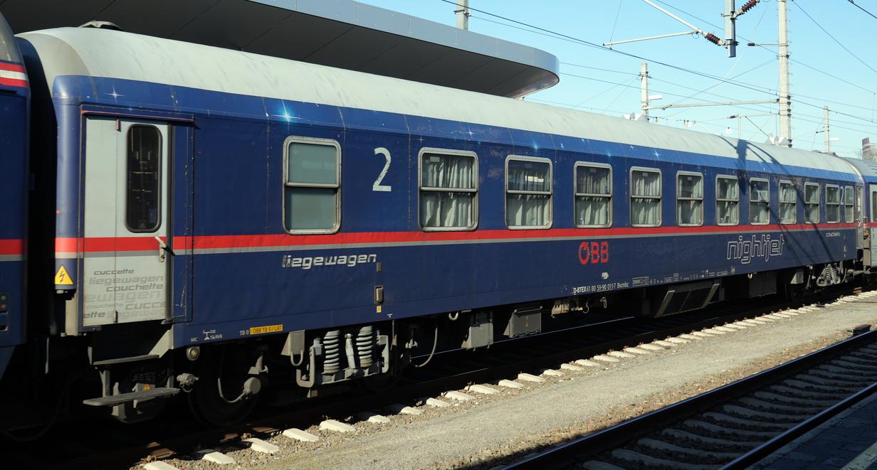 | D-BTEX 61 80 59-90 011-7 Bvcmbz. nightjet 457 (Berlin Gesundbrunnen to Graz). Some time ago these cars of German origin have been sold to BTEX but are still used in ÖBB nightjet trains, in ÖBB nightjet design. Graz Hbf, 2026-02-27. |