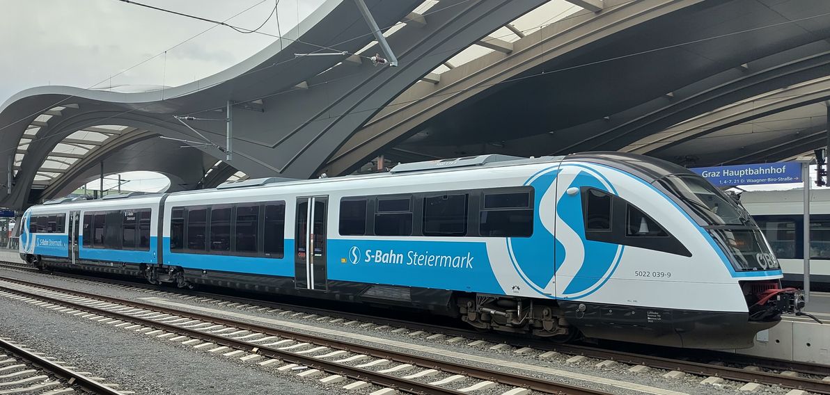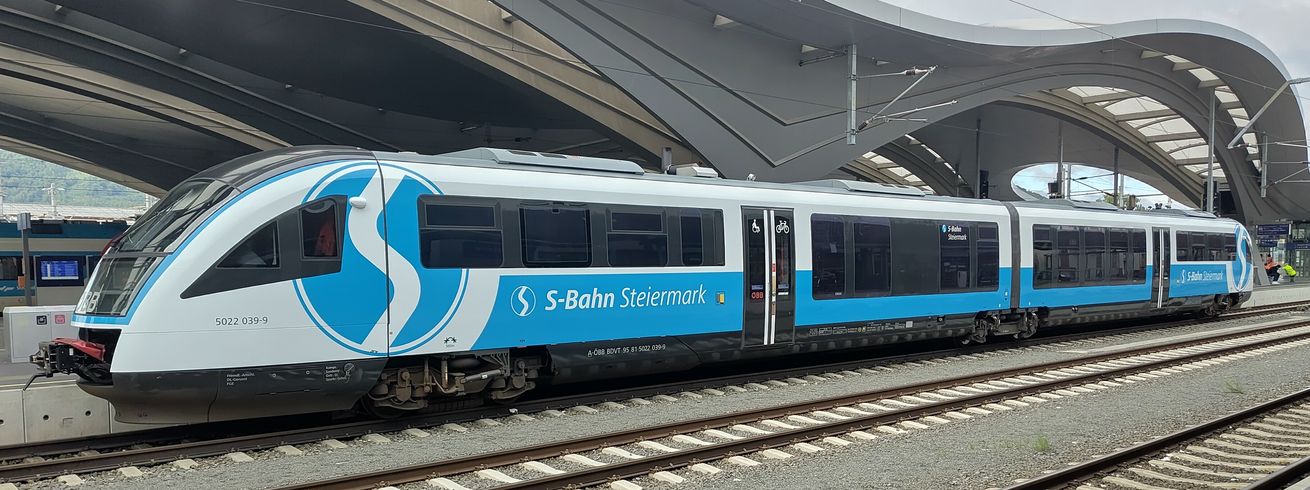 A-ÖBB 95 81 5022 039-9, diesel Desiro in special livery for S-Bahn Steiermark. Used on the line between Graz and Szentgotthárd. Graz Hbf, 2025-10-06. |