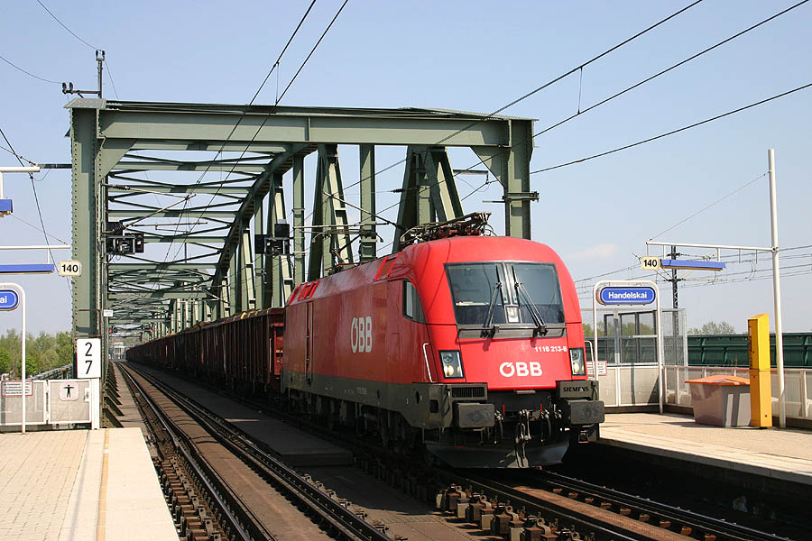 1116 213 was passing station Handelskai with a redirected freight train on 23rd Apr 2005.