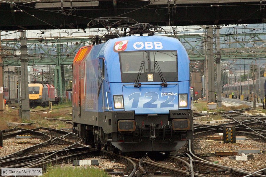 ÖBB - 1116250-0 Lok 1116 250-0 (Werbung: Notruf 122 - Schnell wie die Feuerwehr) in Wien Westbahnhof am 14. September 2008.