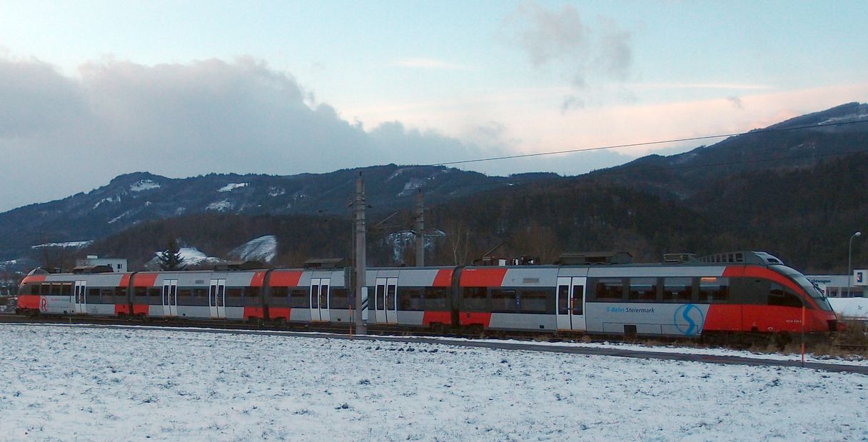 | ÖBB 4024 038-4 as regional train 1710 Neumarkt - Mürzzuschlag between Leoben and Niklasdorf. This unit has received new branding "Regiobahn Steiermark / S-Bahn Steiermark". 2014-12-30. |