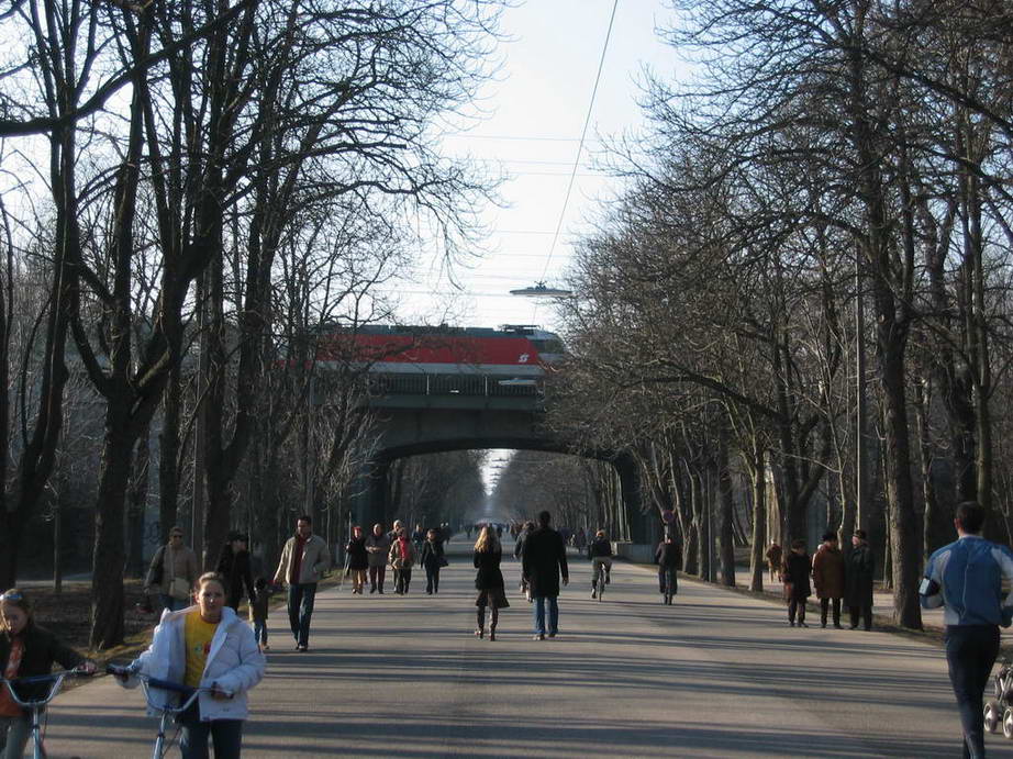 ÖBB 1014 mit EC 70 "Smetana" (Wien Süd - Praha Holesovice) über die Brücke über die Prater Hauptallee (zwischen Wien Haidestraße und Wien Praterkai). Photo v. Michael Katai, 19.03.2006 |