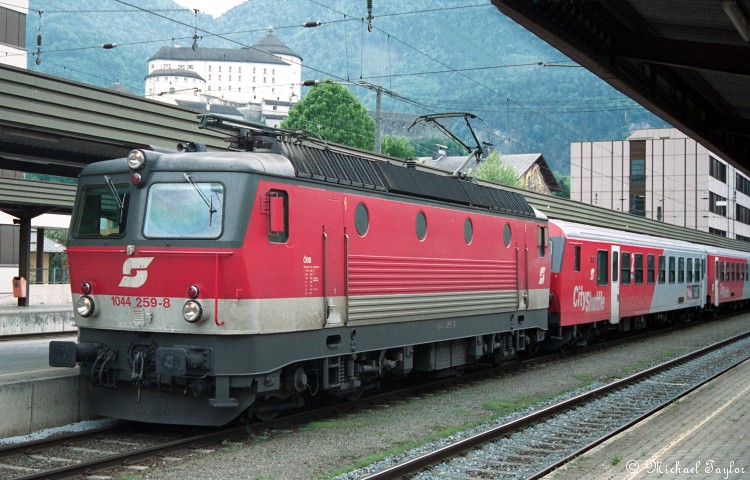 ÖBB Class 1044 Electric Locomotive. 1044 259-8 coupled to a City Shuttle Steuerwagen at Kufstein on Monday May 12th, 2003.