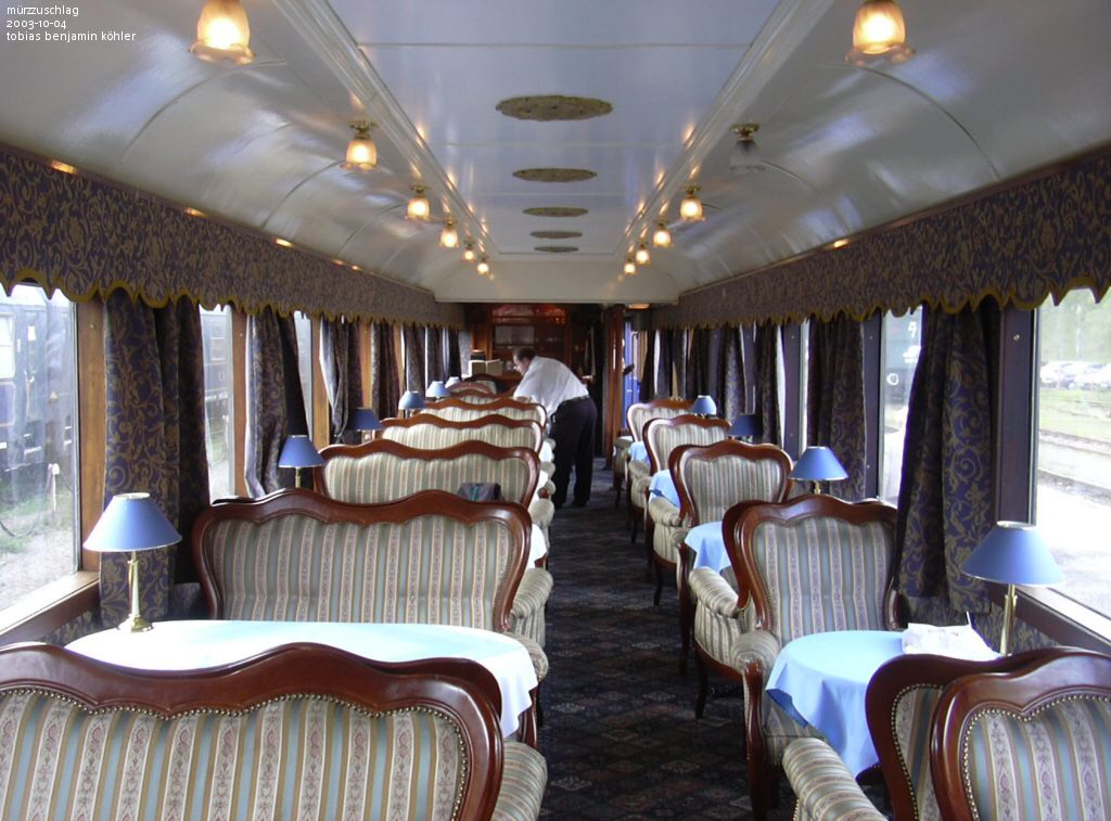 | Brenner & Brenner "Salon Bleu" 50 81 09-69 000-0 (140 km/h). In 1997 the car has received a new interior with couches, armchairs and tables. The background part has a piano and a kitchen with bar. Mürzzuschlag, 2003-10-04. |