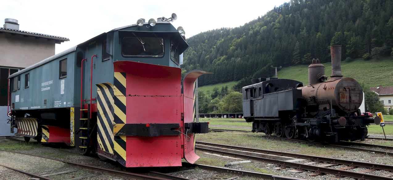 | Erzbergbahn 99 81 9592 519-8 together with steam locomotive 97.201. Vordernberg south depot, 2021-09-18. |