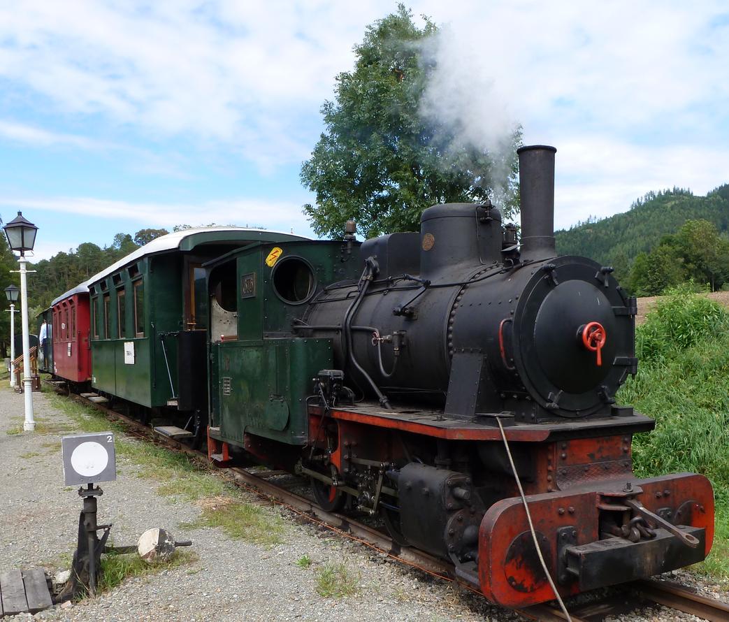 | Gurkthalbahn locomotive 13 with museum train in Pöckstein-Zwischenwässern, 2011-08-28. Only 3.3 km of the original 28.9 km long line are preserved. |