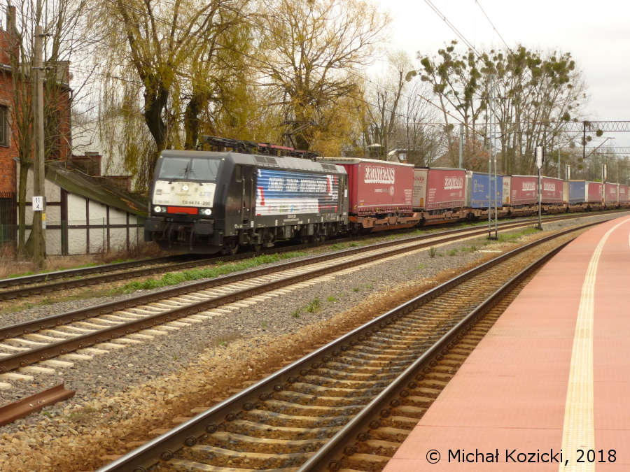 LTE ES64F4-200 with a rake of pocket wagons for the carriage of semi-trailers is passing Poznan Staroleka, Poland, 19.11.2017.