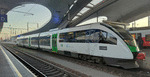 | 95 80 0 643 113-3 A-STBPV, Talent diesel-hydraulic unit (Talbot 1998) running between Graz and Weiz Nord via Gleisdorf. This unit has quite an eventful history: Built 1998 for Angel Trains (the continental European branch of which was reorganized into Alpha Trains from 2007) and rented to Ostmecklenburgische Eisenbahn, from 2005 to 2006 operated by Ostseeland Verkehr (Ola), 2006 to 2013 by Nord-Ostsee-Bahn, 2013 to 2020 by Bayerische Oberlandbahn. In 2023 it was sold along with two other units to Steiermarkbahn. The three Talent units received different designs, this one is in the current corporate livery of StB with a night blue window band and green doors and front ends, baptised "lucky Panther". Gleisdorf, 2024-04-12. |