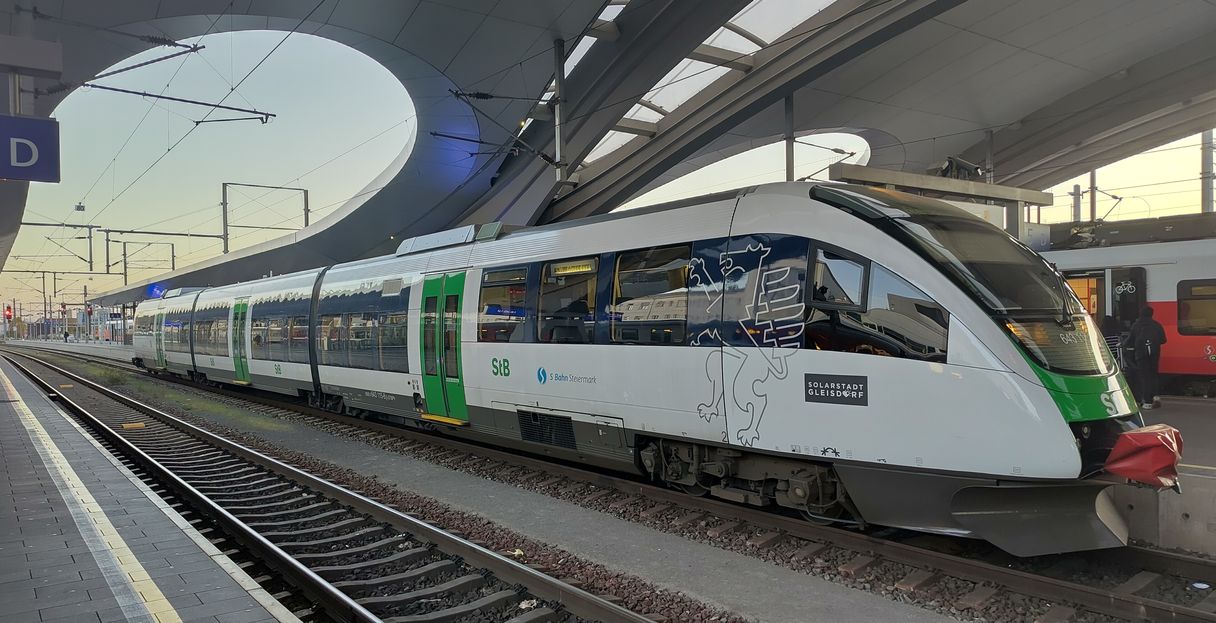 | D-STBPV 95 80 0 643 115-8, line S31 from Graz to Weiz. This unit, built 1998 by Talbot, has in the past operated in different German regions for Ostmecklenburgische Eisenbahngesellschaft, Ostseeland Verkehr, Nord-Ostsee-Bahn, Bayerische Oberlandbahn and Transdev Regio Ost, it has recently received a branding for "Solarstadt Gleisdorf". Graz Hbf, 2025-10-31. |