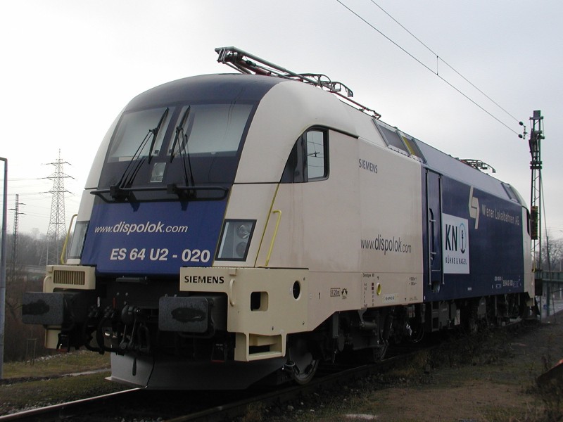 Siemens dispolok ES 64 U2-020 is rented by and in service for Wiener Lokalbahn AG. It arrived in Duisburg-Rheinhausen on 20th of December 2003. The Loco owns a second 'name' for the stupid electronically systems: 182 520. Photo by Arnim v. Herff (arnimvherff@uni-duisburg.de) 2003 |