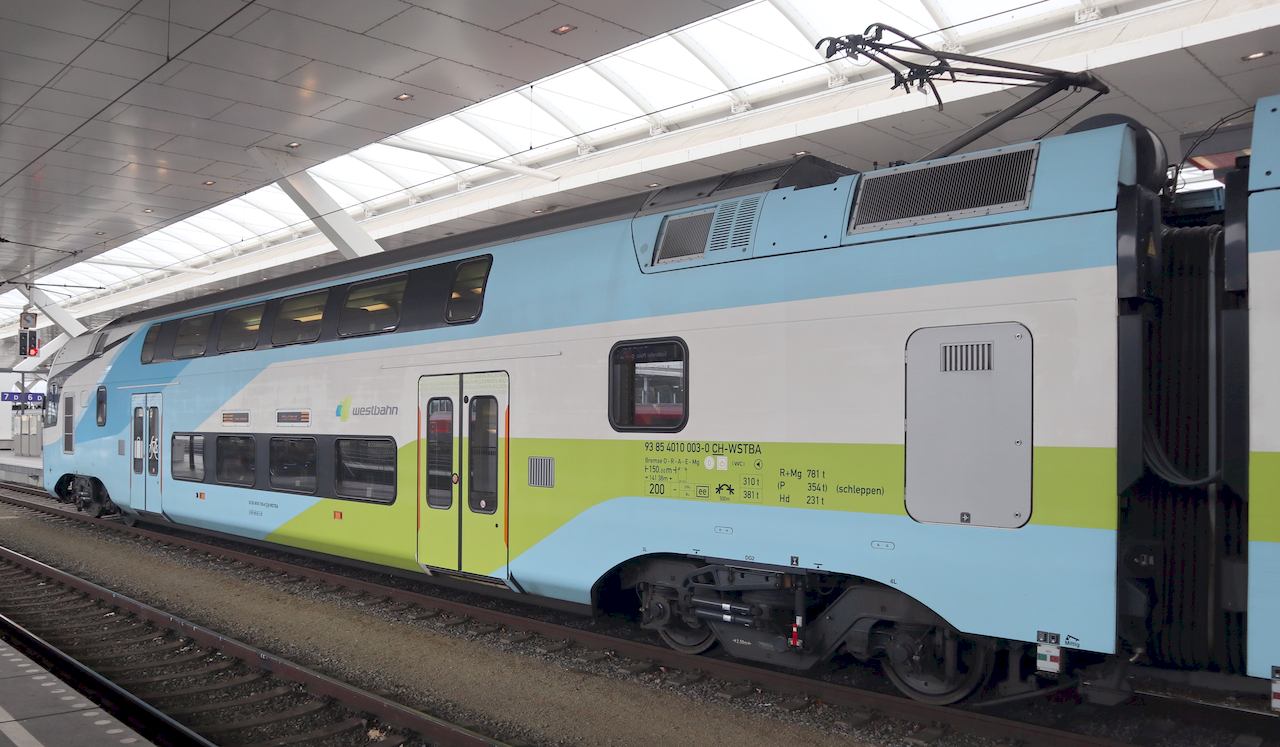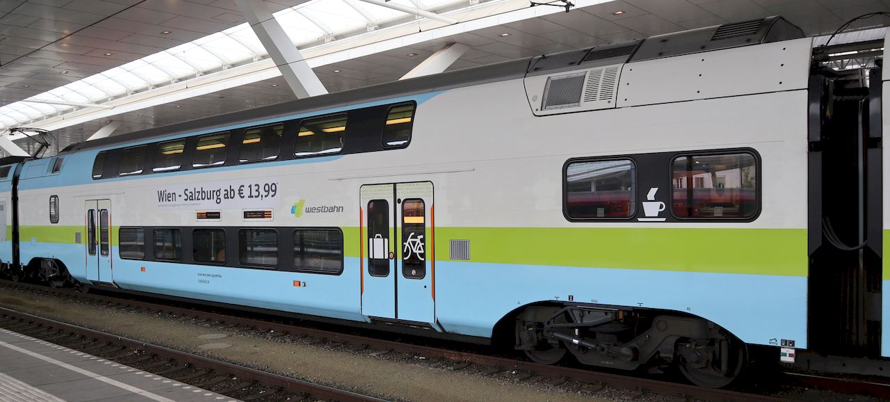 | Westbahn 93 85 4010 003-0 CH-WSTBA with middle car 93 85 4010 203-6, train WB 911 to Wien Westbahnhof. Salzburg Hauptbahnhof, 2019-11-10. |