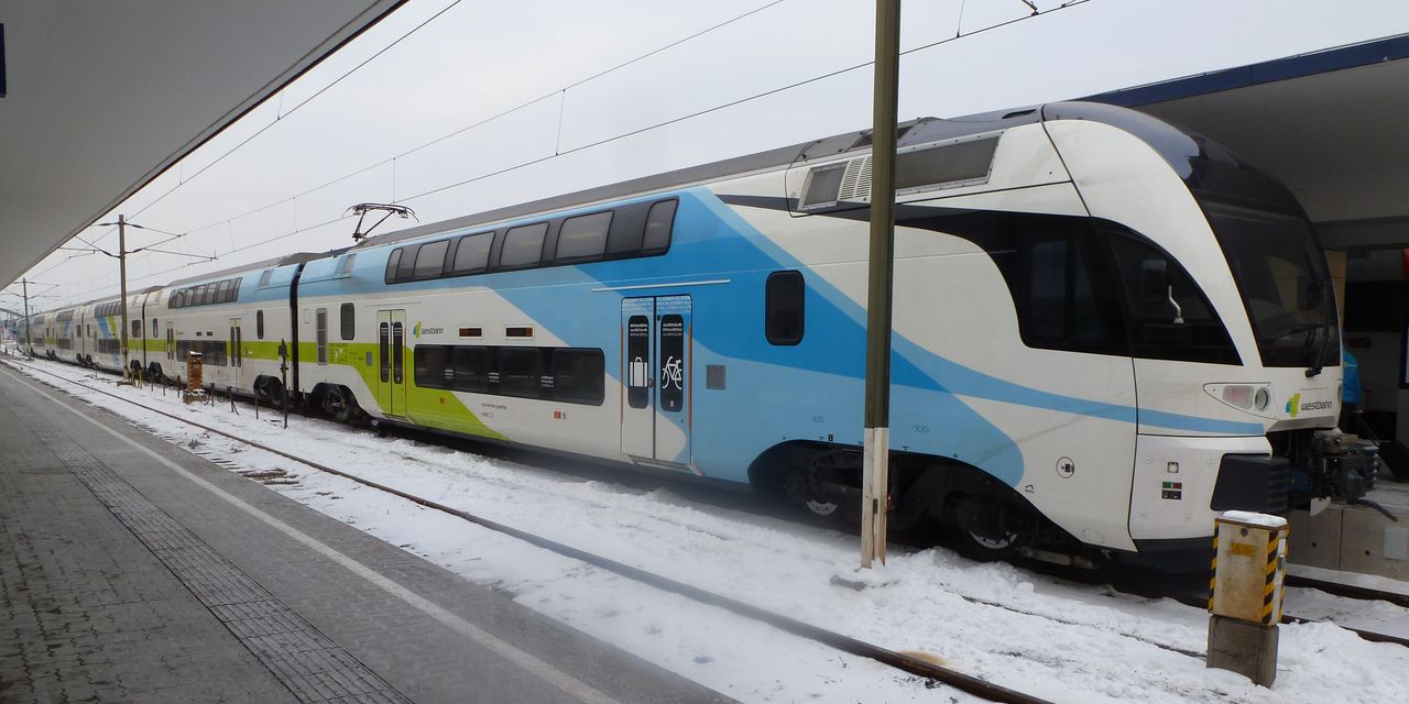 | Westbahn unit 93 85 4010 007-1 (this number refers to the whole train), consisting of the cars (93 85 4010) 107-9, 207-7, 307-5, 407-3, 507-0 and 607-8. Train WB 17514 "Gute Reise im Zug" Wien Westbf - Freilassing. Salzburg Hbf, track 1, 2012-01-01. |