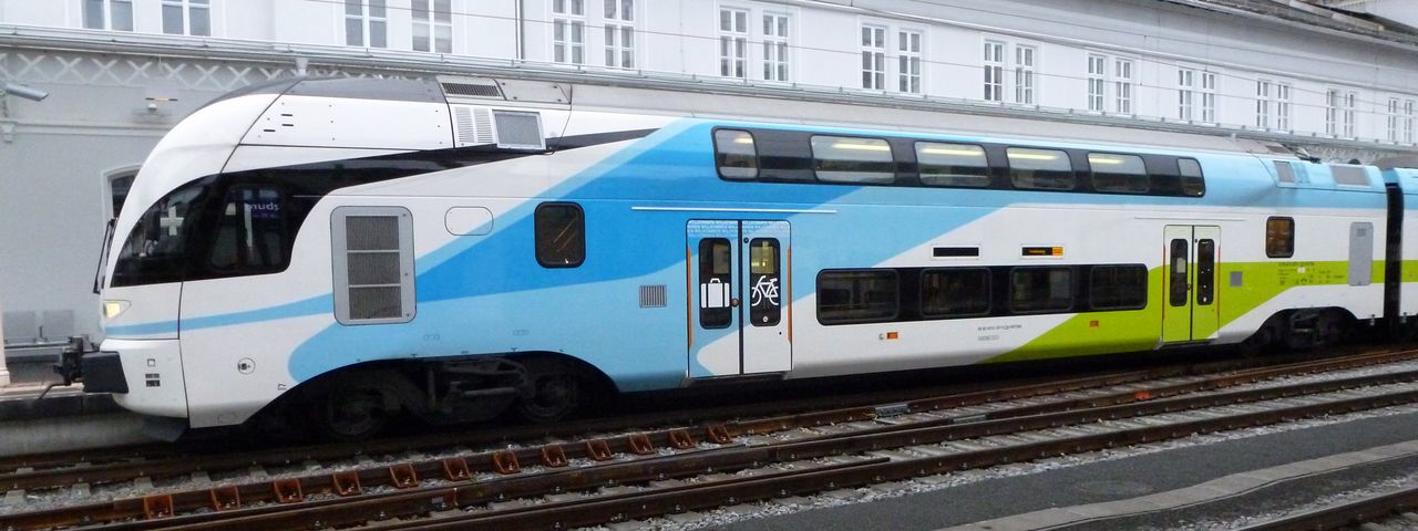 | Westbahn car 93 85 4010 507-0. Seats arranged in rows on both levels, bicycle and baggage rack on the lower level, Westcafé on one end. Salzburg Hbf, track 1, 2012-01-01. |