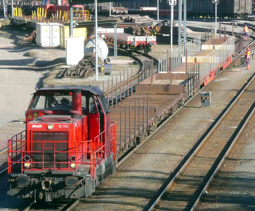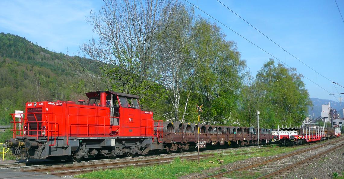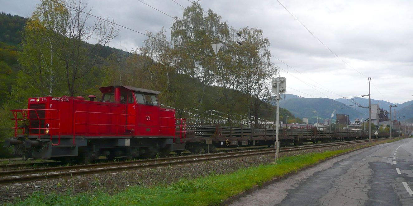 | voestalpine Donawitz, locomotive V1 (92 81 9265 005-9), VSFT MaK G765, with a rail transport train. 2009-10-23. |