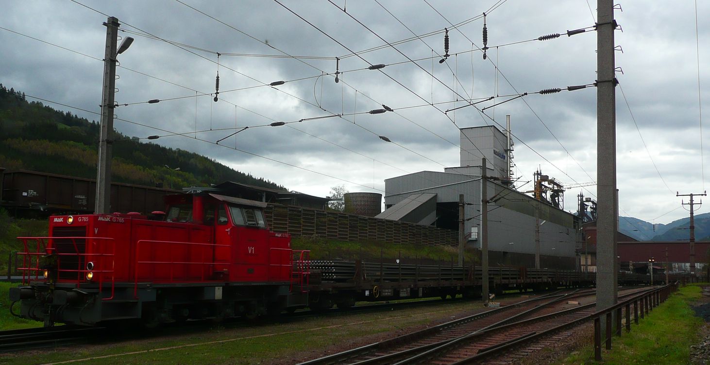 | voestalpine V1 (MaK G765) is shunting freight wagons into the steel works. Leoben-Donawitz, 2011-03-24. |