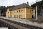 Bahnhof Breitenstein Bahnhofsgebäude, von der Bahnsteigseite aus gesehen und aufgenommen am 18. März 2011. Diese Station befindet sich auf der Nordrampe der Semmeringbahn bei Kilometer 97.6 auf Höhe 791 m.