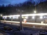 | Leoben, 2005-04-29, 20:40. This station is under rebuilding. One platform has been finished and is nicely illuminated, the other is still a building site, there the supports for the new roof have just been installed. Photo taken out of train IC 613 (Innsbruck - Graz). |