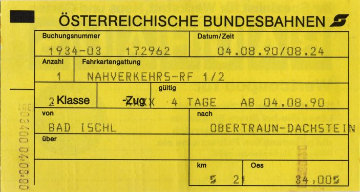 Ticket (Bad Ischl Obertraun-Dachsteinhöhlen and back) for one child (50 percent discount) - issued by ÖBB Bad Ischl.