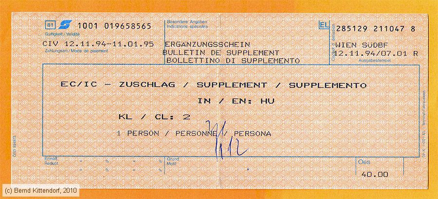 ÖBB - Ergänzungsschein Zuschlag für EC/IC-Züge nach HU, ausgestellt am 12. November 1994 für 40,00 Oes am Schalter in Wien Südbahnhof. Abmessungen: 198 x 84 mm