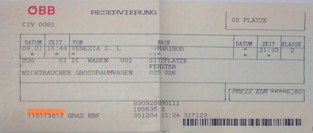 Reservation Venezia SL - Maribor for train EC 50 "Casanova".