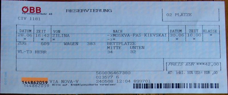 Reservation Zilina - Moskva, train 609.