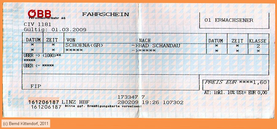 ÖBB - Fahrkarte Fahrschein für eine einfache Fahrt von Schöna (Gr) nach Bad Schandau in der 2. Klasse zum FIP-Preis, ausgestellt am 28. Februar 2009 für 1,60 EUR am Schalter in Linz HBF. Abmessungen: 200 x 85 mm