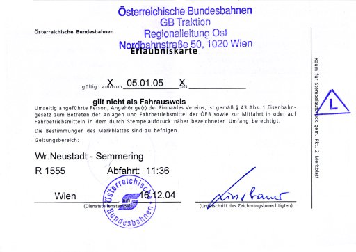 Back side of the permission to ride in the driver's cabin of train R 1555 from Wr.Neustadt to Semmering (Austria)
