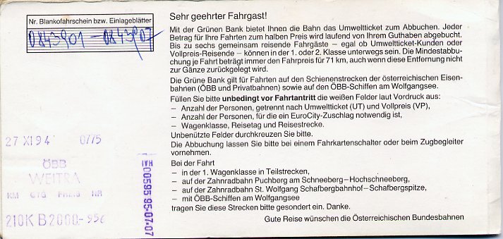 "Grüne Bank" Umschlag / cover Die Grüne Bank wurde von den ÖBB in den Neunzigerjahren angeboten. Der Fahrgast erwarb ein Guthaben von 2000 ATS (ca 140 EUR). Kosten der einzelnen Reisen wurden vom Schaffner im Zug abgebucht. The Grüne Bank was an offer of the Austrian Fedaral Railways in the 1990ies. The passenger aquired 2000 ATS (approx. 140 EUR) travel-credit. Costs for each journey were subtracted by the conductor on train. Scan by Hans Goebl |