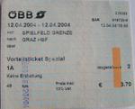 OeBB domestic ticket Spielfeld Grenze - Graz Hbf with Vorteilscard discount, issued at Spielfeld-Strass (ticket machine, 2004-04-12).