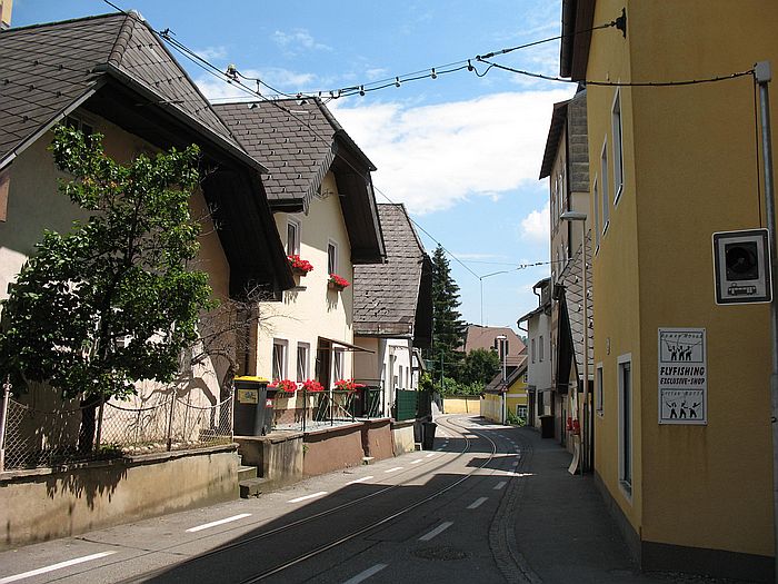Gmunden tram near Kupferzeile stop. For cars this a one way road. However, the tram is running in both directions. 15.6.2008 Martin P. |