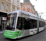 | Graz Linien Variotram 204 at Jakominiplatz, advertisement for "Next Liberty". Up to now all trams had partly green painting, many traditionalists are missing that about the Variotrams. 2011-04-09. |