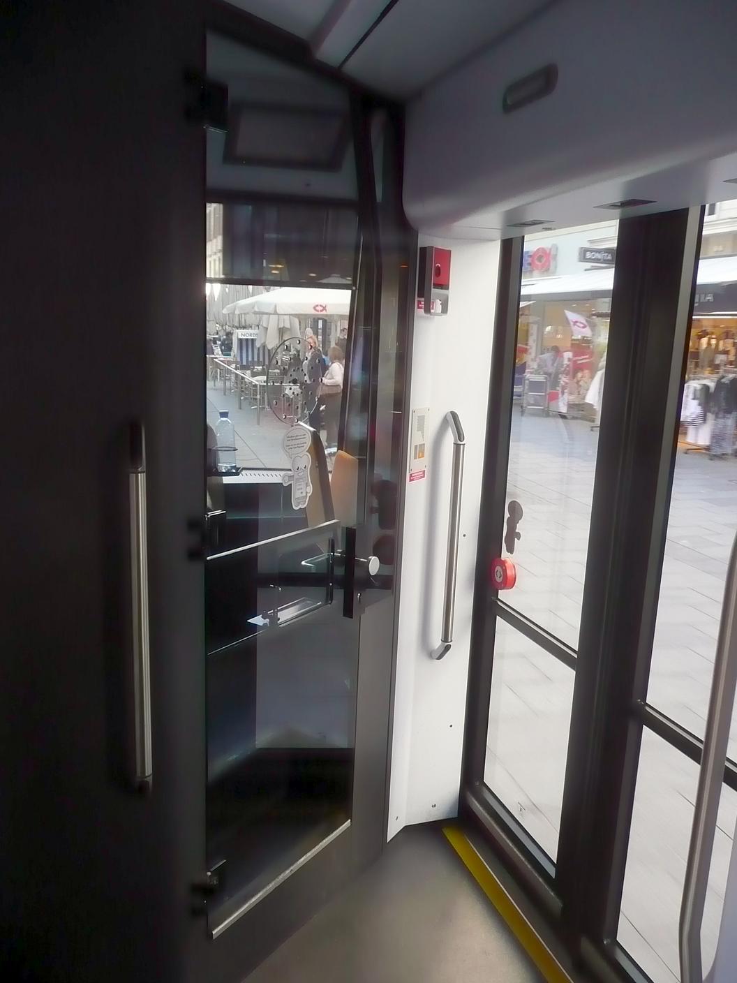| Graz Linien Variotram 202, interior at the front end. Due to the cab there is not much space to line up for the door. 2011-04-09. |