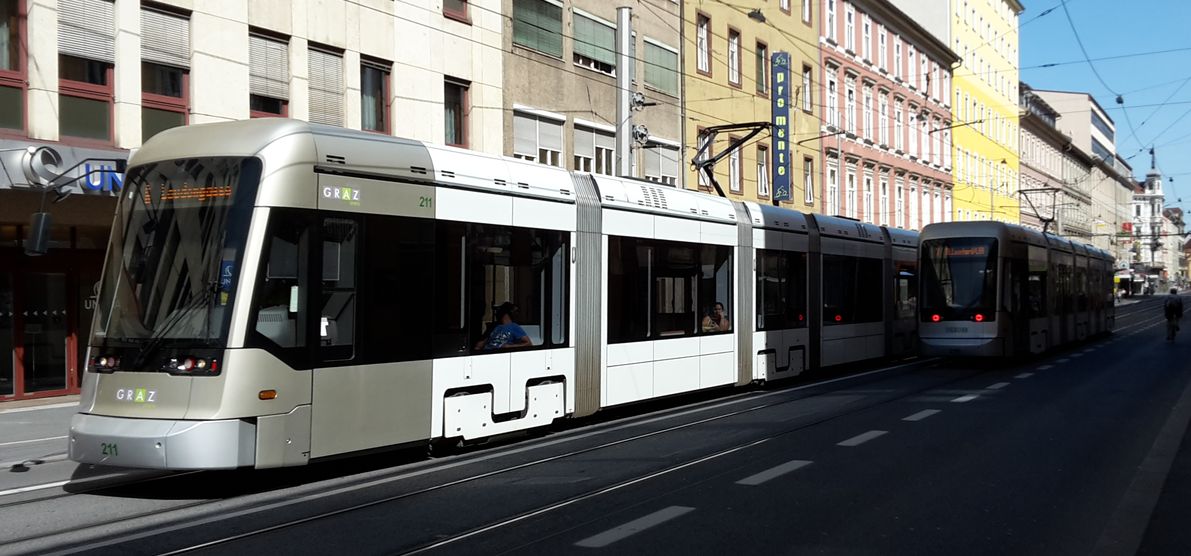 | Graz tram 201 in Annenstraße. Line 7 to Wetzelsdorf. 2015-08-29. |