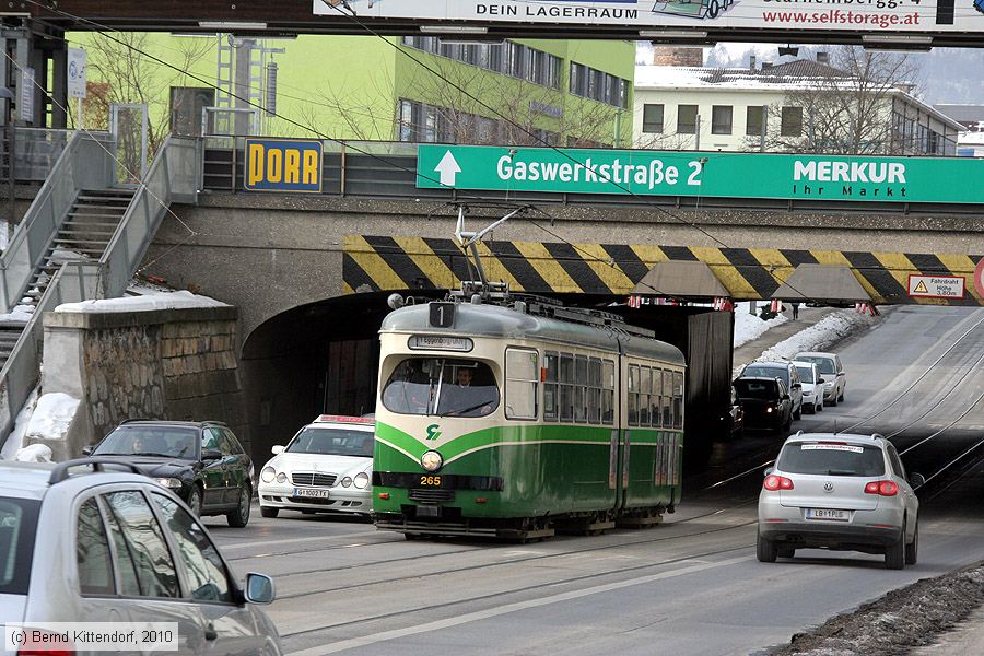 Straßenbahn Graz - 265 Triebwagen 265 auf Linie 1 an der Unterführung beim Hauptbahnhof am 03. Februar 2010.