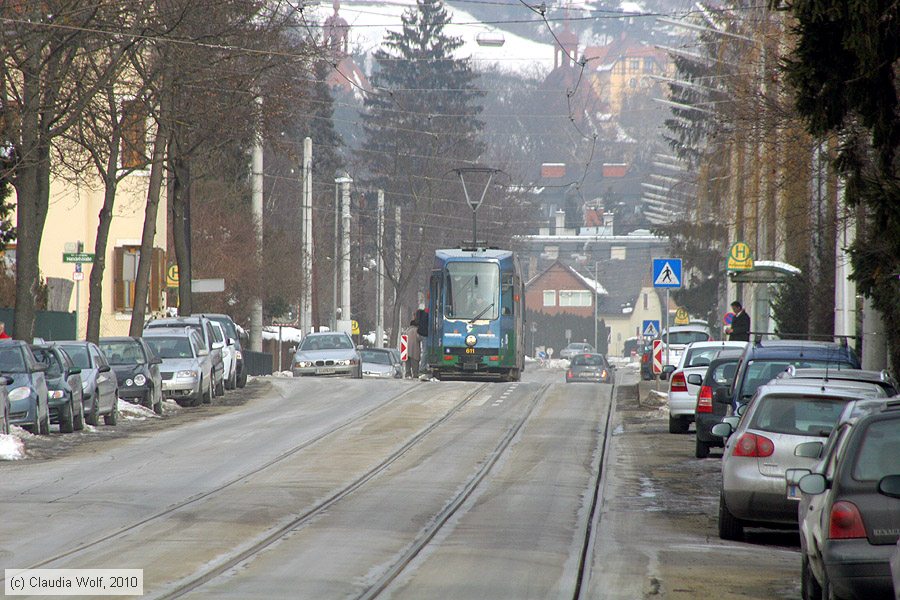 Straßenbahn Graz - 611 Triebwagen 611 auf Linie 7 kurz vor der Ankunft an der Endstelle Wetzelsdorf am 03. Februar 2010.