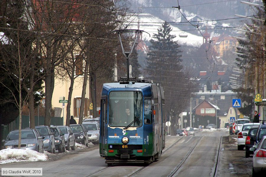 Straßenbahn Graz - 611 Triebwagen 611 am 03. Februar 2010 auf Linie 7 nahe der Haltestelle Eggenberger Gürtel.