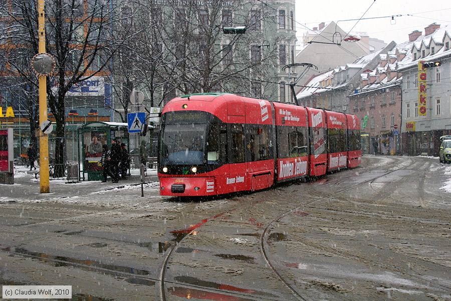 Straßenbahn Graz - 653 Triebwagen 653 auf Linie 6 am Hauptbahnhof, aufgenommen am 03. Februar 2010.